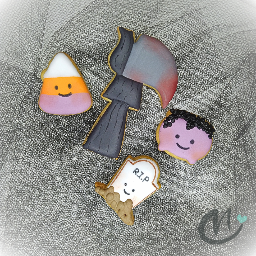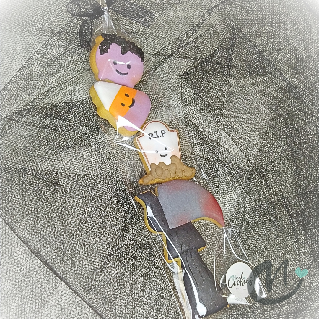 Galletas de mantequilla, artesana, elaborada una a una y decorada con glasa real, con forma de Caramelo, Tumba, Caldero y Guadaña. Las galletas son ideales para endulzar o regalar en una fiesta de Halloween. 👻🎃