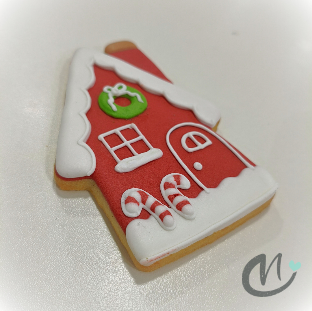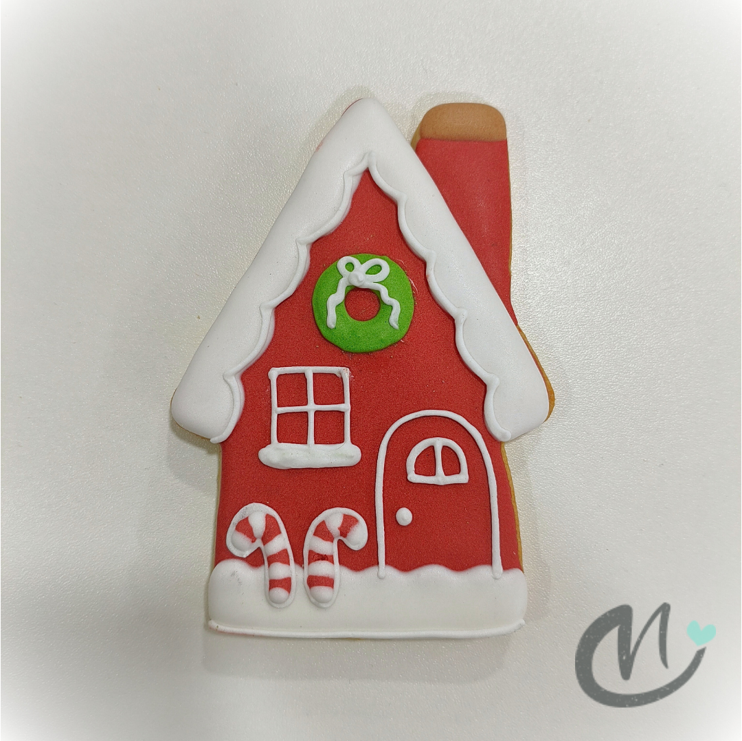 Galleta de mantequilla, artesana, elaborada una a una y decorada con glasa real, con forma de Casita navideña. La galleta es ideal para endulzar o regalar en una fiesta de Navidad. 🎄 ❄️