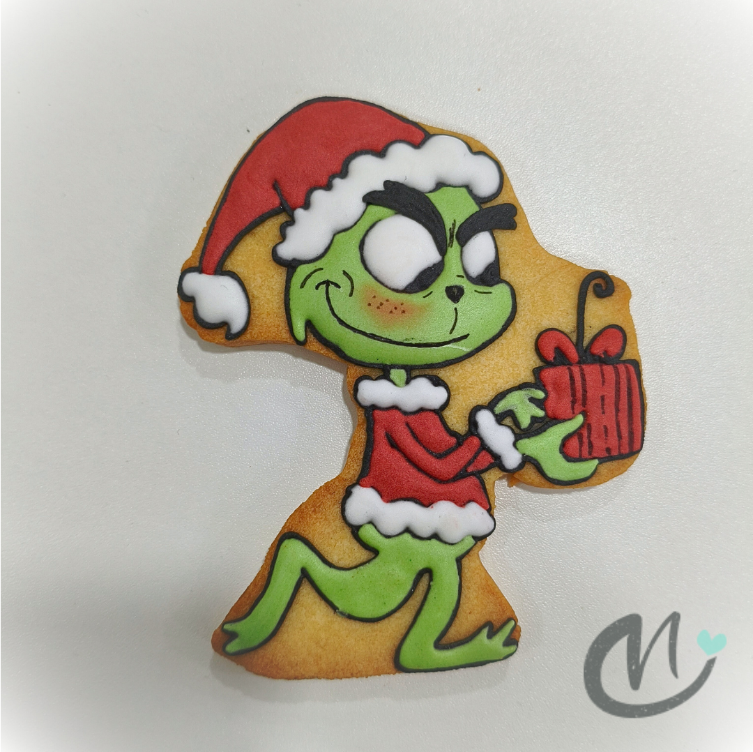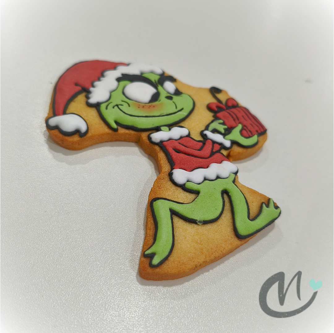 Galleta de mantequilla, artesana, elaborada una a una y decorada con glasa real, con forma de El Grinch. La galleta es ideal para endulzar o regalar en una fiesta de Navidad. 🎄 ❄️